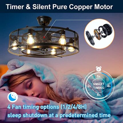 26” Farmhouse Ceiling Fan with 6 Lights, Industrial Indoor/Outdoor Ceiling Fan Lighting, Matte Black Flush Mount Ceiling Fan Lights, Cage Ceiling Fan with Remote 3 Speed Timing (Bulb Not Incl)