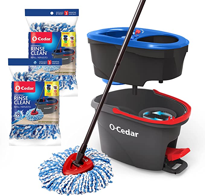 - CONTINUOUSLY CLEAN WATER: O-Cedar’s EasyWring RinseClean Microfiber Spin Mop & Bucket Floor Cleaning System highlights our patented dual-chamber bucket technology which features separated clean and dirty water tanks, making it easy to continuously mop with clean water! It is safe on all hard floor surfaces, including finished hardwood, wood, laminate, tile, vinyl and more.